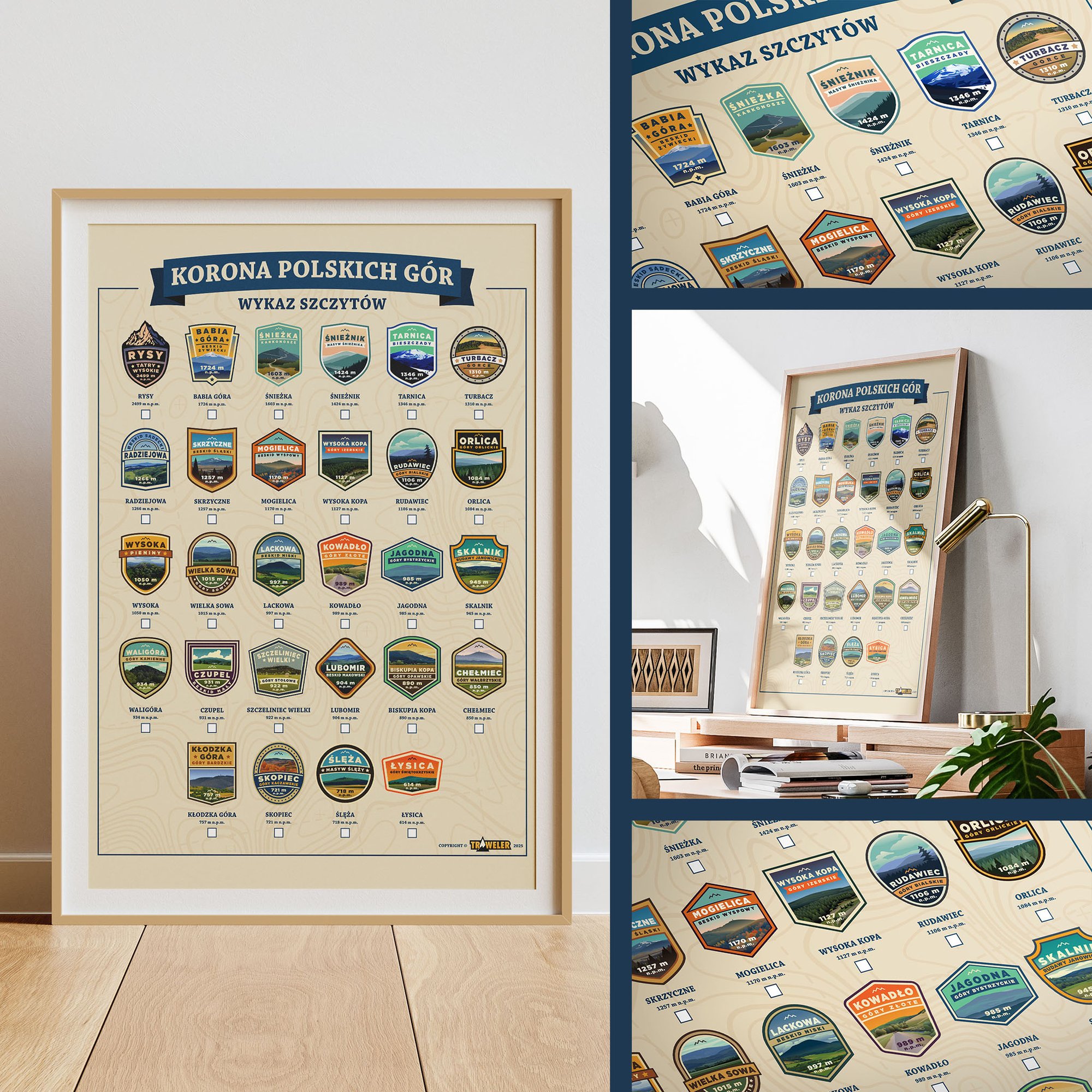 Plakat turystyczny "Korona Polskich Gór" – Wykaz 28 najwyższych szczytów pasm górskich w Polsce.